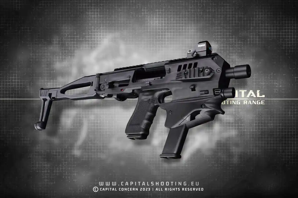 Sie können die Glock CAA MCK () ausprobieren, ein beliebtes Waffenzubehör, das oft in Taktikfilmen zu sehen ist. Es wandelt eine Handfeuerwaffe in eine hochstabile Waffe im Karabiner-Stil um.